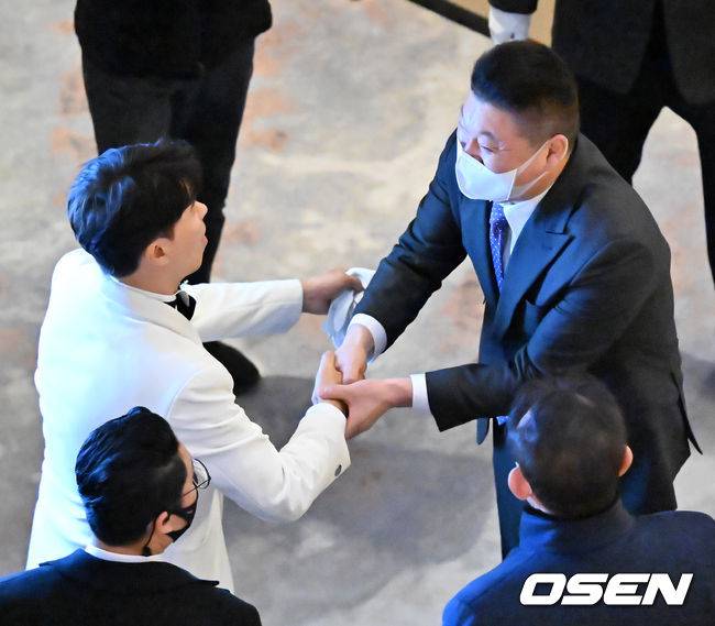 방송인 강호동이 신랑 박수홍에게 다가가 결혼을 축하고 있다. 2022.12.23 / rumi@osen.co.kr