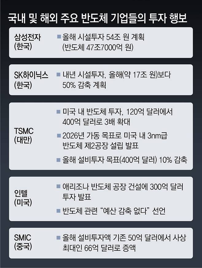실제로 경쟁국의 반도체 기업들은 투자를 적극적으로 늘리고 있다. 지난해 삼성전자의 설비 투자는 2020년(345억4290만 달러) 대비 14.5% 늘어난 데 비해 대만 TSMC는 같은 기간 180억5570만 달러에서 67.7% 확대했다. TSMC는 올해 투자도 360억 달러(약 46조 원)로 전년 대비 크게 늘려 집행한다.