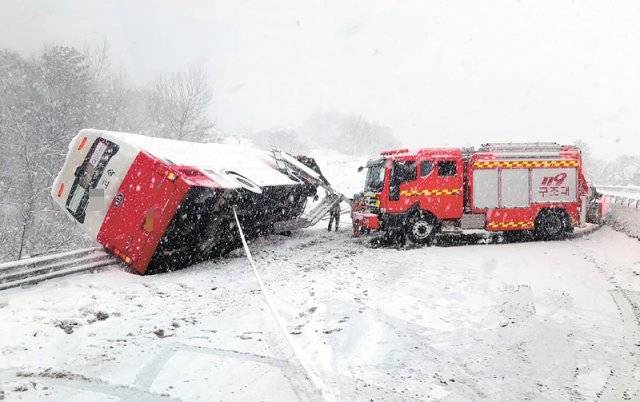 넘어진 고속버스 견인 23일 오전 전남 곡성군 호남고속도로에서 넘어진 45인승 고속버스를 소방차가 견인하고 있다. 버스에는 승객 10명이 타고 있었으나 모두 안전벨트를 하고 있어 인명 피해는 없었다. 이날 오후 3시 기준 곡성군에는 17.2cm의 눈이 내렸다. 담양=뉴시스
