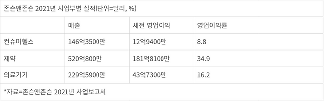 존슨앤존슨은 지난해 938억 달러의 매출액을 냈는데, 이중 가장 많은 비중(55%)을 차지한 사업부문은 제약 사업부문입니다. 제약 사업부문은 이 회사가 1961년 인수한 벨기에 소재 기업 얀센입니다. 얀센은 코로나19 백신을 비롯해 자가면역질환 치료제 스텔라라, 레미케이드 등 의약품을 만들고 있습니다. 그 다음으로 매출 비중이 높은 사업부(29%)는 의료기기 부문이고, 컨슈머헬스 사업부문은 매출액의 16%를 내고 있습니다. 우리가 잘 알고 있는 ‘타이레놀’, ‘지르텍’ 등 일반의약품을 비롯해 구강청결제 ‘리스테린’, 샴푸 ‘니조랄’, 로션 ‘존슨즈’, 콘택트렌즈 ‘아큐브’ 가 대표적으로 이 사업부에 포함됩니다.