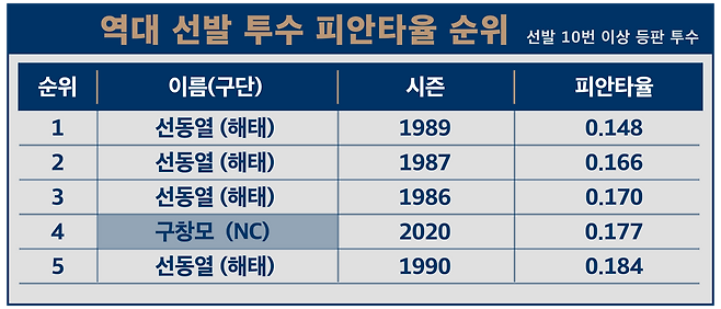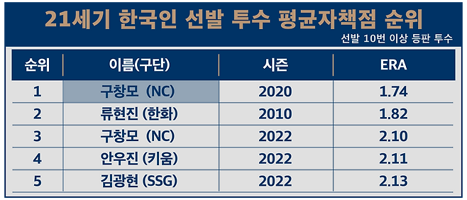 2020년의 구창모는 선동열을 제외하면 한국 야구사에서 비견할 데가 없는 임팩트를 남긴 투수였고, 2022년의 구창모 역시 메이저리거 류현진을 제외하면 넘어서는 이가 존재하지 않았습니다. 결국 현재의 KBO리그에서 구창모가 지닌 가치가 얼마나 대단한지를 쉬이 짐작할 수 있는 대목입니다.