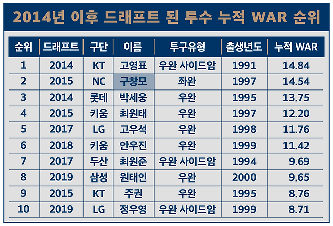 10개 구단 체제가 된 이후인 2014년 드래프트 이후에 뽑힌 젊은 투수들 중에서 구창모는 2위에 해당하는 누적 WAR을 쌓았습니다. 심지어 1위인 고영표와 차이는 0.3승에 불과하고, 나이는 6살이나 어립니다. 게다가 자세히 보면 한 가지 사실을 더 깨달을 수 있습니다. 구창모가 상위 10명 중 유일한 왼손잡이라는 점입니다.