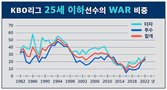 실제 유망주라고 부를 수 있는 25세 이하 선수의 전체 선수 대비 WAR 비중은 1994년엔 전체의 51.6%, 2008년에 32.4%에 달했는데, 1990년대 중반 출생 선수들이 본격적으로 프로에서 입성한 뒤인 2010년대 중반 ‘골짜기’처럼 움푹 파였습니다.