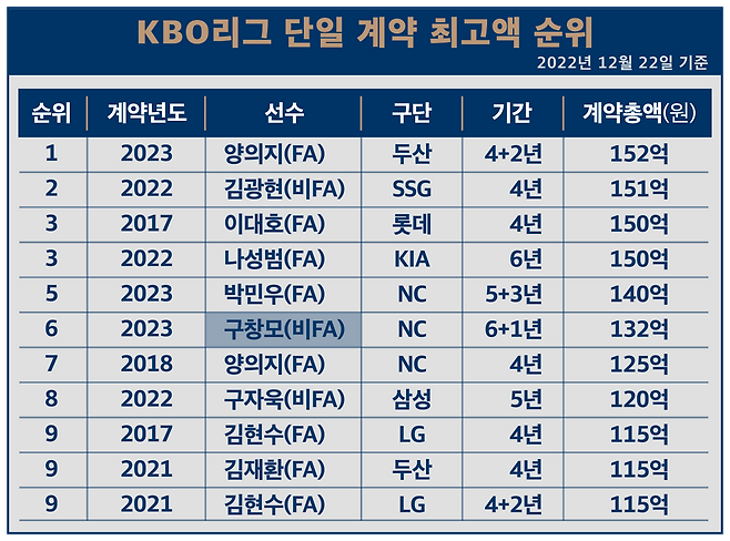 최근 들어 대형계약이 쏟아지고 있는 KBO리그에서도 구창모의 계약은 전체 6위 규모이고, 자유계약선수(이하 FA) 신분이 아닌 선수로는 메이저리그에서 선발로 뛰다 컴백한 김광현 다음가는 거액입니다.