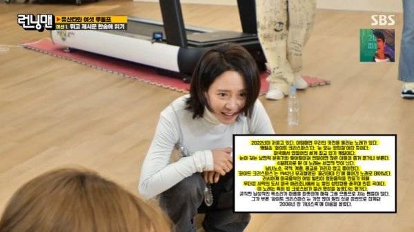 멤버들의 우려대로 송지효는 고무장화 때문에 러닝에 어려움을 겪었다.