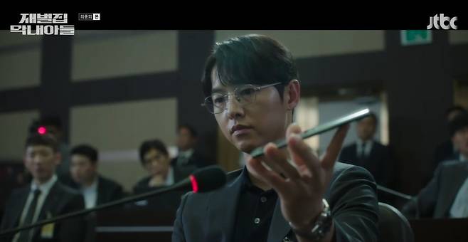 25일 방송된 JTBC '재벌집 막내아들'에선 청문회를 통해 20년 전 살인사건의 진실을 밝히고 순양 오너일가 경영권 박탈에 일조하는 현우(송중기 분)의 모습이 그려졌다.