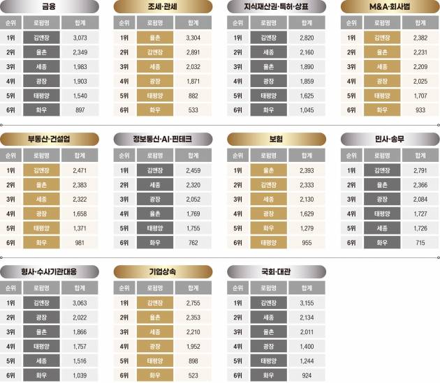 부문별 전문성 순위에서는 ‘조세·관세’와 ‘보험’ 부문에서 김앤장을 밀어내고 1위를 차지하기도 했다. 김앤장 이외에 부문별 전문성 조사에서 1위에 이름을 올린 로펌은 율촌이 유일하다.