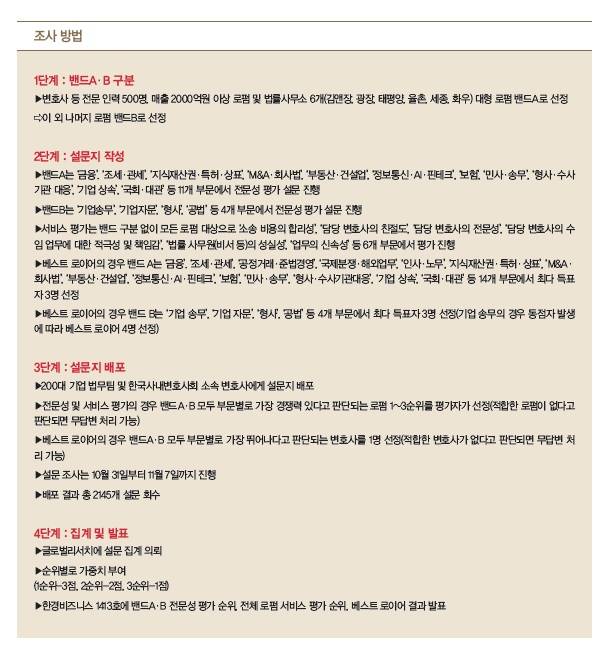 한경비즈니스는 2010년부터 매년 ‘대한민국 베스트 로펌&변호사’ 조사를 진행해 왔다. 로펌과 함께 업무를 진행하는 사내 변호사들과 주요 대기업 법무팀에 설문지를 돌려 가장 뛰어난 역량을 가진 로펌과 변호사가 누구인지 물었다. 로펌의 실수요자인 이들이 직접 로펌의 경쟁력을 평가하도록 하기 위해서다.