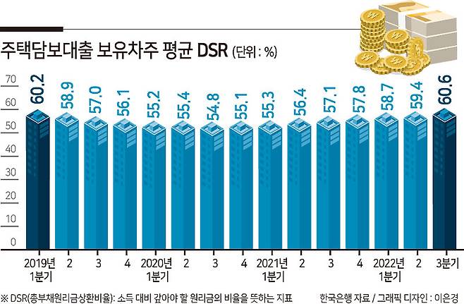 ▶주담대 보유차주 평균 DSR 60%...월급 절반 이상 대출로= 26일 한국은행이 가계부채 데이터베이스(DB)를 분석해 계산한 결과에 따르면 3분기 기준 주택담보대출 보유차주의 평균 DSR은 60.6%로 3년 6개월 만에 다시 60% 선을 넘어섰다.