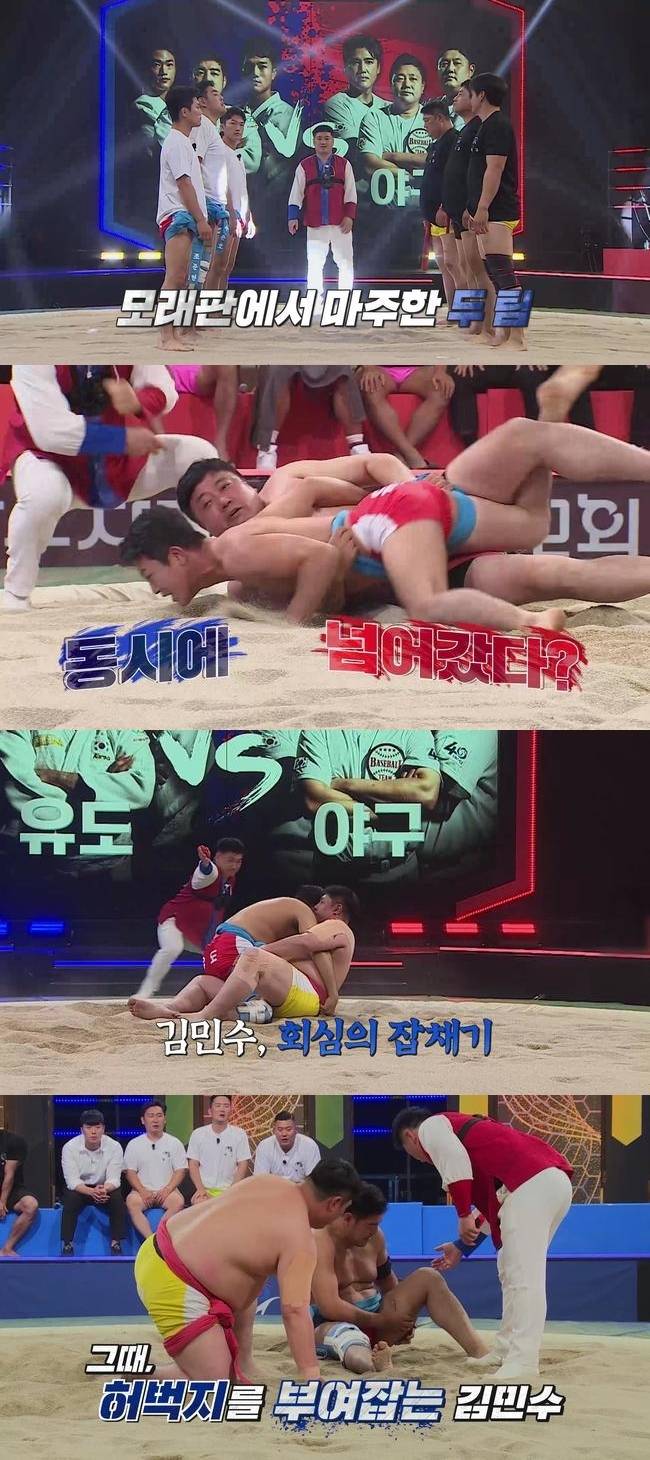 마지막 결승전을 앞두고, 유도팀과 야구팀은 장사복을 입은 채 위풍당당하게 모래판에 등장했다.
