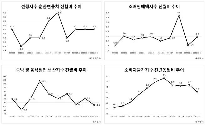 전조는 올해 4분기부터 나타나고 있다. 물가는 정점을 지났다고 하지만 여전히 5%를 지속하고 있고, 내년 초에도 4%대를 이어갈 가능성이 크다. 여기에 보복 소비로 일부 호조세를 보여온 대면서비스업 소비가 주춤하고 있다. 심리지수도 여전히 암울하다.