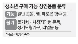 여성가족부의 '청소년유해물건(성기구) 및 청소년 출입·고용금지업소 결정 고시'에 따르면 청소년은 일반 콘돔, 젤, 페로몬 향수 등은 구입 가능하나 돌기형·사정지연형 콘돔, 성기모형기구, 리얼돌 등은 구매할 수 없다. 헌법재판소는 작년 6월 요철식 특수콘돔, 약물주입 콘돔 등이 청소년 유해물건이라는 규정에 합헌 결정을 내리기도 했다.