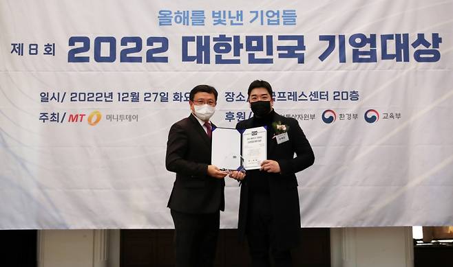 권택준 네오엔터디엑스 대표(사진 오른쪽)가 27일 오후 서울 중구 한국프레스센터에서 열린 머니투데이 주최의 '2022 제8회 대한민국 기업대상' 시상식에서 '버추얼 인플루언서' 부문으로 '스타트업' 분야 3년 연속상을 수상한 뒤 이종섭 동국대학교 교수와 기념사진을 찍고 있다.