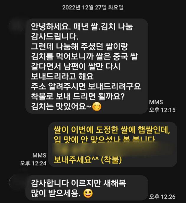 해당 문자를 받은 B 씨는 "올해 도정한 햅쌀"이라면서 "입맛에 맞지 않으셨던 것 같다. 착불로 보내달라"며 쌀을 돌려받을 주소를 전달했습니다.