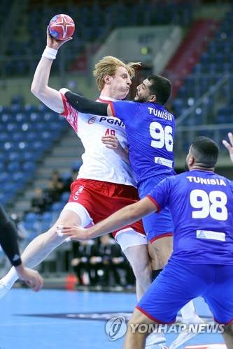 epa10380511 Tomasz Gebala (L) of Poland and Anouar Ben Abdallah (C) and Islem Jbeli (R) of Tunisia in action during the 4 Nations Cup Handball Tournament match between Poland and Tunisia in Krakow, south Poland, 28 December 2022. EPA/Lukasz Gagulski POLAND OUT