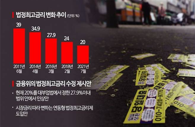 금융위가 제시하는 대안은 크게 두가지다. 금융위 고위관계자는 "현재 20%인 법정최고금리를(대부업법에서 정한 27.9% 이내 범위 안에서) 올리는 방법도 있고, 시장금리에 따라 오르내리는 연동형 법정최고 금리제도 또다른 방안"이라며 "정치권에서 조정안에 찬성해주진 않아도 최소한 반대는 하지말아야 제도를 손 볼 수 있다"고 했다.
