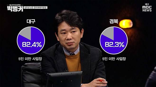 중대재해에 취약한 50인 미만의 소규모 기업은 지역으로 갈수록 더 많습니다. 5인 미만 사업장 비율이 전국에서 대구가 두 번째, 경북이 세 번째로 높습니다. 2019년 기준 대구의 5인 미만 사업장은 전체의 82.4%, 경북은 82.3%였습니다. 중대재해처벌법 즉각 시행 대상인 50인 이상 사업체 수는 각 지역별 전체 산업 사업체 수 대비 1%에 그치는 수준입니다. 그러니까 대구와 경북지역 사업체의 99%가 적용이 안 된다는 얘깁니다.