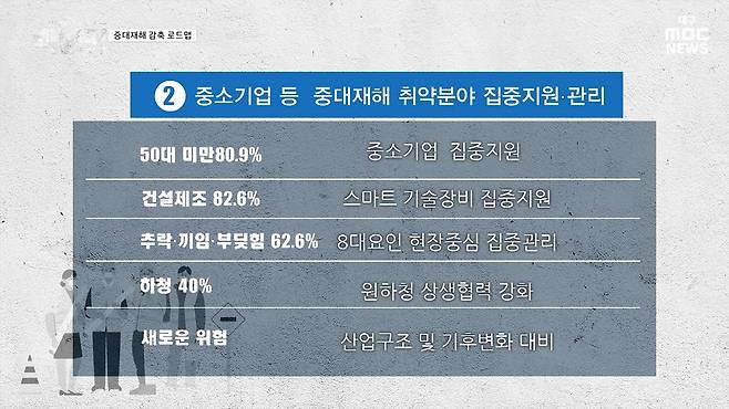 우지영 나라살림연구소 수석연구위원 "우리나라는 산업구조 상 50인 미만의 소규모 기업이 많은데요, 2020년 고용노동부가 발표한 현황에 따르면 사업장 규모별로 가장 많은 게 5인에서 49인 미만 사업장으로 전체의 42.4%를 차지해요. 5인 미만 사업장이 두 번째로 높은 38.3%죠. 그러니까 50인 미만의 소규모 사업장에서 전체 사망사고의 80.7%가 발생한 겁니다. 결국 중대재해처벌법에서 처벌 적용이 안 되는 곳에서 많이 발생한다는 얘깁니다"