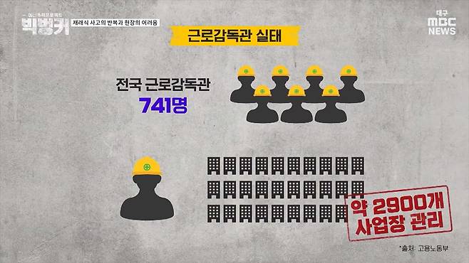 기업 현장을 감시하고 감독하는 인원은 얼마나 될까요? 2022년 1월 말 기준으로 전국 산업 안전보건 분야 근로감독관 수는 한 명이 약 2,900곳의 사업장을 담당하고 있습니다. 노동자 수로 친다면 1인당 2만 5천 명이 넘는 노동자를 관리해야 하는 수준인 겁니다. 특히 대구와 부산의 경우 근로감독관 한 명이 많게는 2천 개의 기업을 담당하고 있습니다. 과중한 업무로 제대로 된 감시나 관리가 힘들고 현장의 노동자들은 관리·감독이 형식적으로만 이뤄진다고 느낄 수밖에 없습니다. 결국 지자체의 지원이 필요하다는 주장이 나오는 지점입니다.