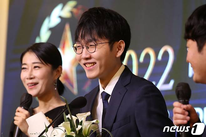 (서울=뉴스1) 이승배 기자 = 신진서 9단이 29일 오전 서울 서초구 리버사이드 호텔에서 열린 '2022 바둑대상'에서 최우수기사상(MVP) 수상 소감을 밝히고 있다.