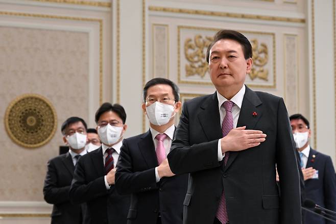 | ▲ 윤석열 대통령이 지난 28일 오전 청와대 영빈관에서 열린 2023년 과학기술정보통신부·개인정보보호위원회·원자력안전위원회 업무보고에서 국기에 경례를 하고 있다. |