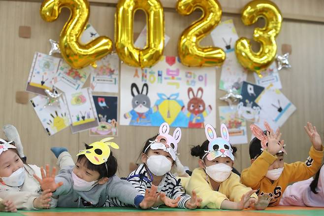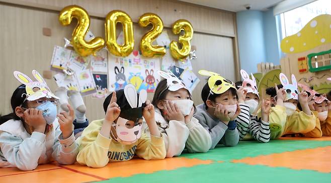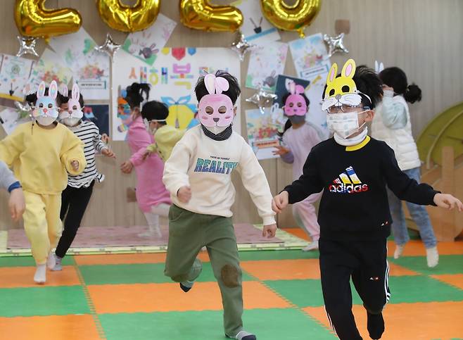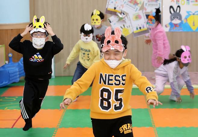 (광주=연합뉴스) 조남수 기자 = 계묘년 토끼해를 사흘 앞둔 29일 광주 북구청 어린이집에서 아이들이 토끼 가면을 쓰고 놀이를 즐기고 있다.