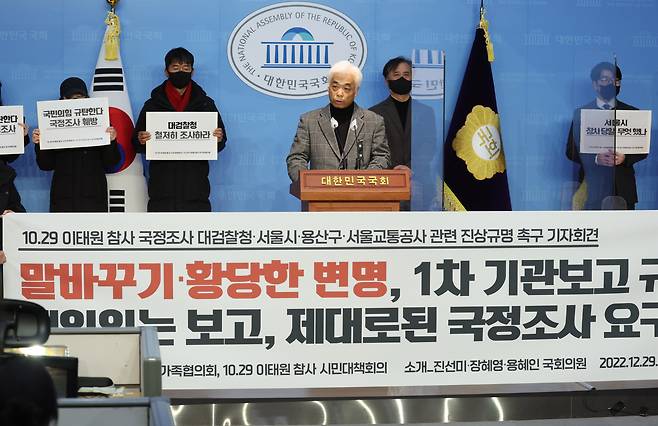 | ▲ 이종철 10·29 이태원 참사 유가족협의회 대표가 29일 오후 국회에서 진선미·장혜영·용혜인 의원 소개로 열린 기자회견에서 대검찰청·서울시·용산구·서울교통공사의 참사 관련 진상규명을 촉구 기자회견을 하고 있다 |