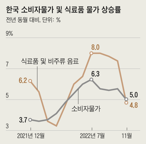 그런데 식료품 가격만은 고공행진을 이어가고 있다. 미국의 경우 지난달 식료품 물가는 10.6% 올라 전체 물가 상승률을 훨씬 상회한다. 세부 항목 가운데 달걀은 49.1% 치솟았고, 우유(27%)와 빵(15.7%) 등 상당수 품목이 두 자릿수 증가율을 보였다. 우리나라도 6~10월 식료품 및 비주류음료 물가가 매달 6~8%씩 뛰어 전체 물가상승률을 2% 안팎 웃돌았다.