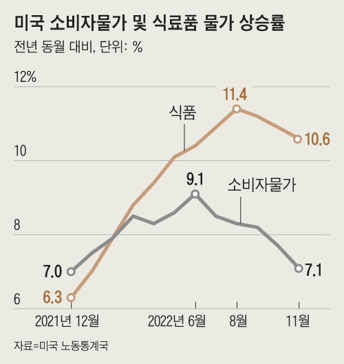 공급망 차질과 전쟁 등으로 활활 타오르던 물가가 조금씩 꺾이는 기미가 보인다. 올 들어 최대 10%에 육박하던 미국 소비자 물가상승률은 11월 7.1%(전년 동월 대비)로 낮아졌다. 우리나라 소비자물가도 7월에 정점(6.3%)을 찍은 뒤 지난달에는 5%로 상승폭이 꺾였다.
