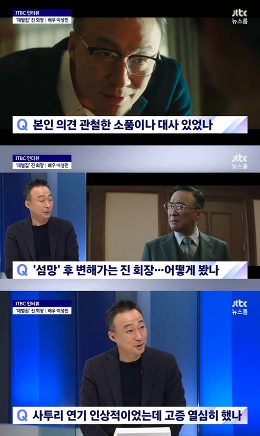 29일 방송된 종합편성채널 JTBC '뉴스룸'에는 '재벌집 막내아들'에서 진양철 회장을 연기한 이성민이 출연, 뒷이야기를 직접 전했다.