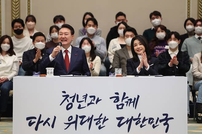 | ▲ 윤석열 대통령과 김건희 여사가 20일 오후 청와대 영빈관에서 열린 청년과의 간담회에서 웃음짓고 있다. |