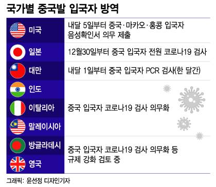 해외는 이미 중국발 입국자에 대한 대응책을 결정했거나, 검토하고 있다. 일본과 대만은 각각 이달 30일과 내달 1일부터 중국 입국자에 대한 코로나19 검사를 의무화 한다. 미국은 상대적으로 강도가 낮은 음성확인서 제출을 요구하기로 했다. 내달 5일부터 중국과 마카오, 홍콩 등에서 입국하는 이가 대상이다. 인도와 이탈리아, 말레이시아 역시 중국 입국자 코로나 검사 의무화 방침을 정했다. 방글라데시와 영국 역시 관련 규제 강화를 검토하고 있다.