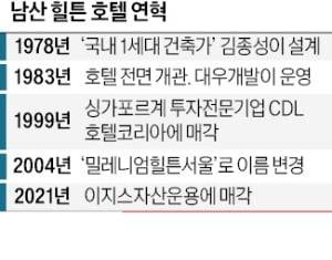 남산 힐튼호텔은 옛 대우그룹의 흥망성쇠를 상징하는 호텔이기도 하다. 김우중 전 대우 회장은 그룹이 급성장하던 1983년 이 호텔을 준공했다. 1978년 김종성 건축가가 설계한 이 호텔은 ‘한국 건축가가 지은 국내 1호 호텔’이란 타이틀을 갖고 있다. 김 전 회장은 미국에서 활동하던 김 건축가에게 설계를 부탁하기 위해 직접 미국을 찾은 것으로 알려졌다. 호텔 꼭대기 층인 23층 펜트하우스는 김 전 회장이 개인 집무실 겸 영빈관으로 사용했다.