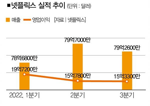 리드 헤이스팅스 CEO의 설명대로 그간 넷플릭스는 '광고 없이'도 승승장구했다. 유료 가입자가 내는 구독료만으로도 충분했다. 2022년에도 분기당 70억 달러(약 8조8690억원)를 웃도는 매출을 기록했다. 수익성이 나빴던 것도 아니다. 매분기 15억 달러가 넘는 영업이익을 달성했다.