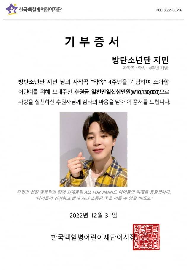 한국백혈병어린이재단은 지민의 자작곡 '약속' 공개 4주년을 기념해 최애돌 서포트팀 '올포지민'(ALL FOR JIMIN)에서 소아암치료비 1013만 원을 기부했다고 지난 29일 공식 SNS를 통해 밝혔다.