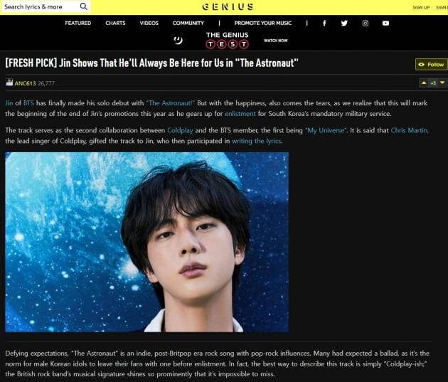 최근, 미국 디지털 음악 매체 지니어스의 '지니어스 코리아'는 "The Astronaut으로 우리와 영원을 함께 할것을 알린 진"라는 제목의 기사를 게재하며 노래 속 담긴 진의 마음과 메세지에 집중했다.