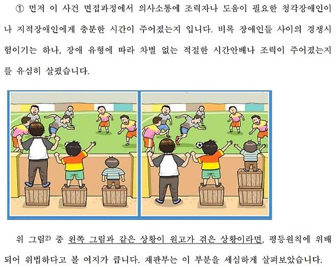 참고 그림도 첨부됐다. 키 작은 사람과 키 큰 사람이 똑같은 높이의 발판 위에서 축구를 관람하는 그림(기회의 평등)과 키가 작을수록 더 높은 발판 위에 서서 관람하는 그림(결과의 평등)을 나란히 배치한 그림으로, 재판의 쟁점인 평등 원칙을 설명하는 자료였다. 재판부는 '모두가 똑같은 높이 발판에 서있다면 평등원칙에 위배되기에 이 부분을 유심히 살폈다'고 설명했다.