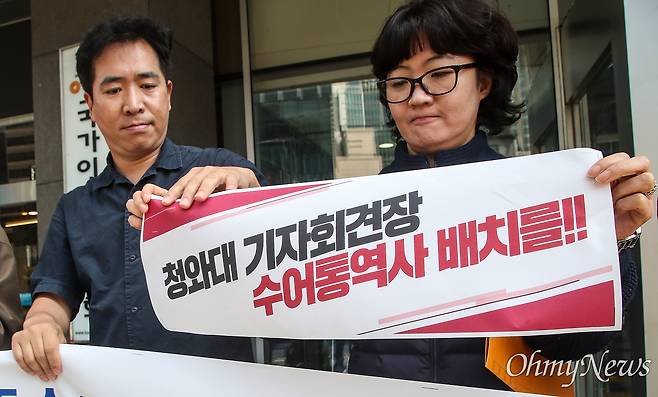 | ▲ 한국장애인연맹과 열린네트워크 서울지부, 자립생활지원센터 with, 에이블 업, 원심회 회원들이 2019년 11월5일 서울 중구 국가인권위원회 앞에서 기자회견을 열어 청각자애인의 알 권리 확대를 위해 청와대, 국회 등 기자회견에 수어 통역사 배치를 요구하고 있다. |