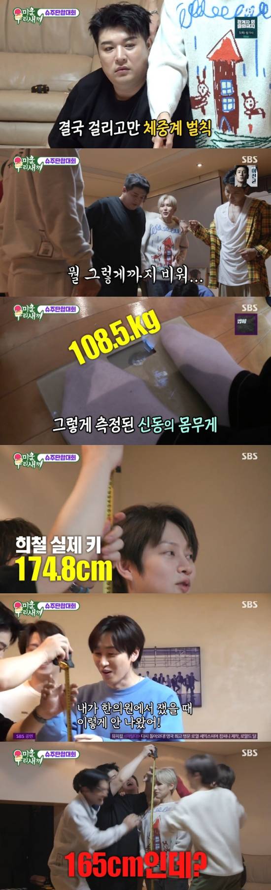 그뿐만 아니라 신동은 체중계에 올라가 몸무게를 쟀고, 그의 몸무게는 108.5kg이었다. 멤버들은 벌칙 때문에 키를 쟀고, 최시원은 183cm, 규현은 178cm, 예성은 175cm, 김희철은 174.8cm, 은혁은 172cm로 측정됐다. 은혁은 네이버 프로필에 등록된 키와 실제 키가 달랐고, "내가 한의원 가서 쟀을 때 그렇게 안 나왔다"라며 어쩔 줄 몰라 했다.