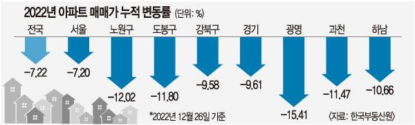 5곳의 규제지역 중 해제가 유력한 곳은 경기 광명, 과천, 하남 등 지난해 부동산 가격이 급락한 지역이다. 한국부동산원에 따르면 지난해 경기 아파트 가격은 9.61% 하락했다. 광명(-15.41%), 과천(-11.47%), 하남(-10.66%), 성남 수정구(-11.06%) 등의 하락세가 두드러졌다. 특히 광명의 경우 지난해 11월 주정심 이후 5주 만에 아파트 가격이 6.80% 하락했다.