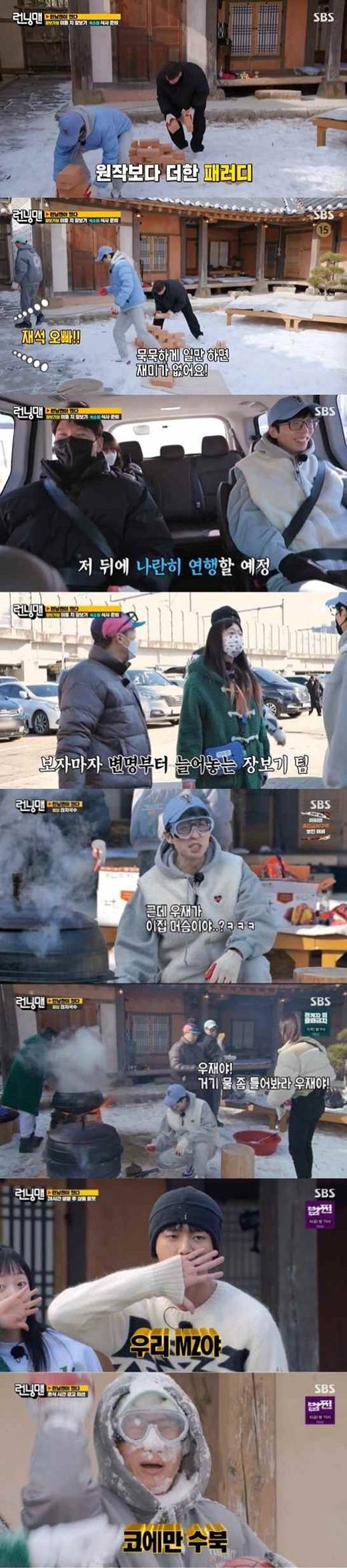 반면 무경험자 지석진은 불이 잘 붙지 않는 장작에 무작정 신문지를 던져 타박을 받는가 하면, 송지효는 송지효는 디포리와 멸치 한 봉지를 모두 육수용으로 넣어 모두를 경악하게 했다. 결국 유재석은 “어차피 나중에 수프 넣을 거니 걱정마라”고 말해 폭소를 자아냈다.