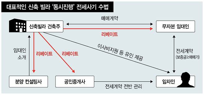 최근 수면 위로 드러난 ‘전세사기’ 한가운데는 빌라 한 채당 수천만원에 이르는 리베이트가 놓여 있다. 이 리베이트를 놓고 건축주와 분양컨설팅사, 공인중개사, ‘바지’임대인 등이 얽히고설켰다. 적게는 400만원, 많게는 1200만원 정도를 리베이트에서 떼내어 세 들어 살 집을 보러온 사람에게 ‘이사 지원금’을 주겠다는 ‘미끼’도 던져진다. 강서구 화곡동 한 신축빌라를 2021년 5월에 전세 계약한 김아무개씨는 “보증보험도 가입된다고 하고, 거기다 1천만원을 지원한다니 대출 이자를 아낄 수 있겠다는 마음이었다”고 말했다.