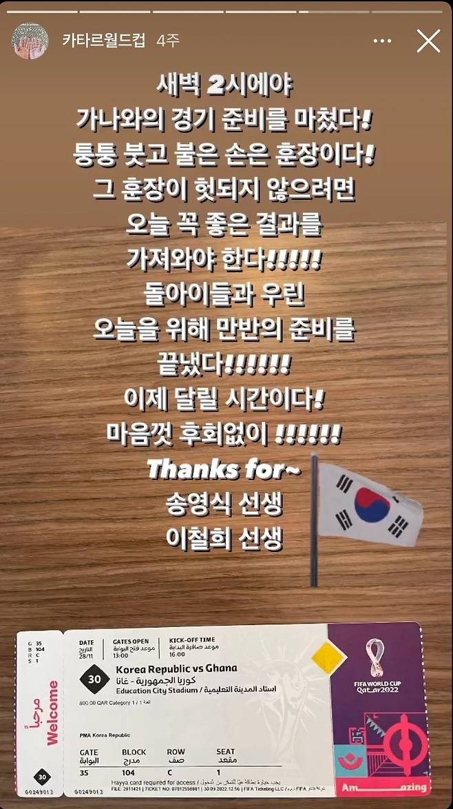 "오늘도 고생 많으셨습니다. 선생님들이 여기 안 계셨으면 저희가 지금 이렇게 뛸 수 있을까. 저희끼리 항상 하는 말이에요. (중략) 선수들은 이번이 마지막 월드컵, 마지막 대표팀 경기라고 생각하며 한 경기 한 경기 끝날 때마다 선생님께 제일 고마워하고 의지하고 있어요."