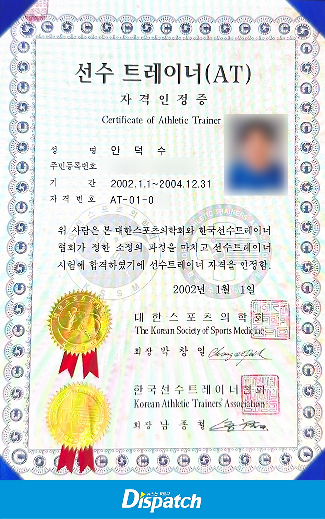 AT-01-0XX. 안덕수의 AT(Athletic Trainer) 자격증 번호다.