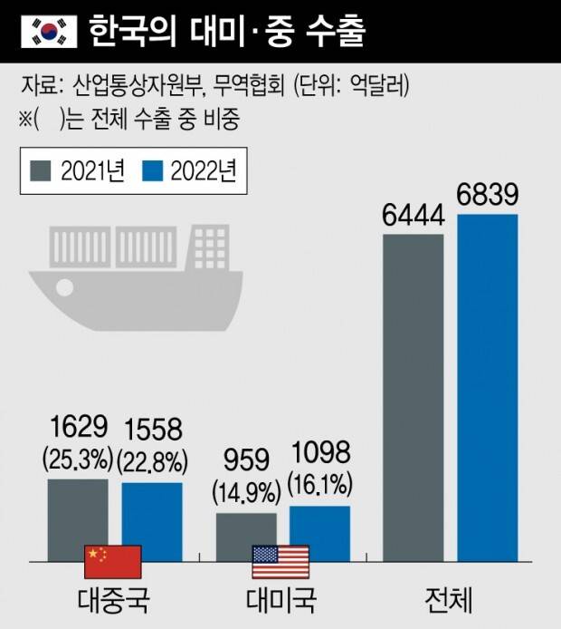 한국의 수출에서 중국의 비중이 뚝 떨어진 대신 미국의 몫은 반사적으로 커졌다. 지난해 대미 수출은 1098억달러로 전체 수출의 16.1%였다. 2021년 14.9%(959억달러)에 견줘 한 단계 높아졌다. 연간 대미 무역흑자는 280억4천만달러로 전년(226억9천만달러)보다 20%이상 늘었다.
