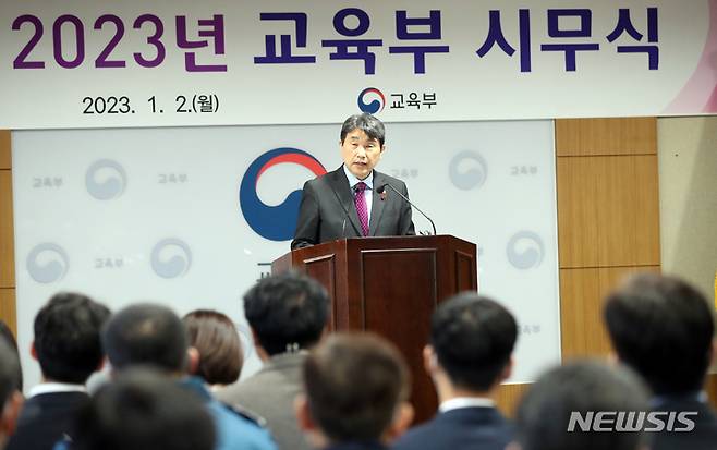 [세종=뉴시스] 강종민 기자 = 이주호 부총리 겸 교육부 장관이 2일 세종시 정부세종청사에서 열린 교육부 시무식에서 신년사를 하고 있다. 2023.01.02. ppkjm@newsis.com
