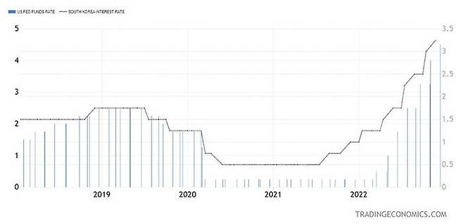 작년 3월부터 12월까지 10개월 만에 제로수준에서 4.5%까지 미국의 급격한 기준 금리 인상은 자산가격의 급격한 하락을 유발하고 있다. 한때 3조 달러에 육박했던 전 세계 가상화폐의 시가 총액은 8천억 달러 선으로 떨어졌고, 미국 나스닥 지수는 3분의 1이 하락했다. 급격한 금리인상에 채권가격도 급락하면서 올 상반기 금융기관들의 대차대조표에는 보유 자산의 가격하락 여파가 그대로 반영돼 나타날 것으로 예상되고 있다.