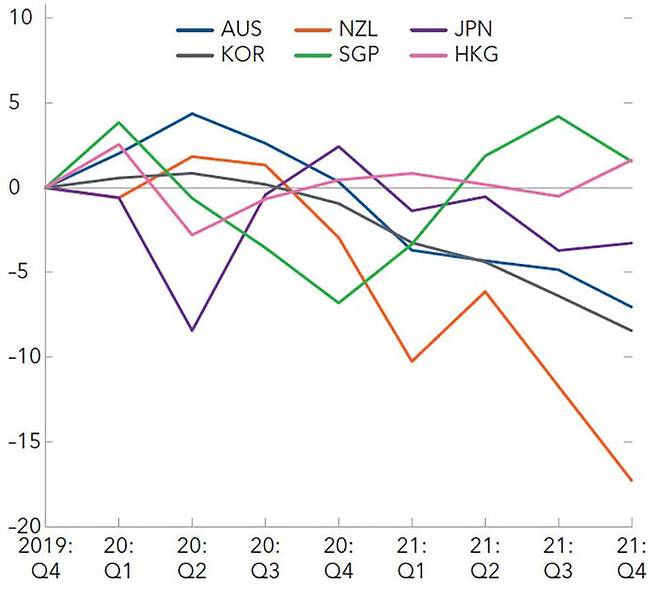 영국의 이코노미스트는 작년 11월 18일 기사에서 중국 이외에도 아시아의 소득대비 집값과 부채 규모가 상대적으로 커서 부동산 버블 붕괴의 위험이 크다고 분석했다. 이코노미스트에 따르면 2021년 말 현재 소득대비 각국 수도의 집값은 홍콩 20배, 한국 19배, 타이완 16배로 집값이 비싸기로 유명한 미국 산호세 12.6배, 런던 8배 보다 비싸다. 국내총생산(GDP) 대비 가계부채는 한국이 105%, 타이완 97%, 홍콩 94%, 미국 77%, 영국 85%로 우리나라가 최고 높다고 지적했다. 2008년 금융위기 당시에는 중국의 성장이 아시아 국가들의 충격을 완화했지만, 지금은 중국의 도움을 기대할 수도 없는 상황이라고 보도했다.