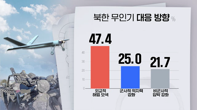 이어 '비례성 원칙 등에 의한 군사적 억지력 강화'가 25%, '대북 경제 제재 등 비군사적 압박 강화'가 21.7%를 나타냈습니다.