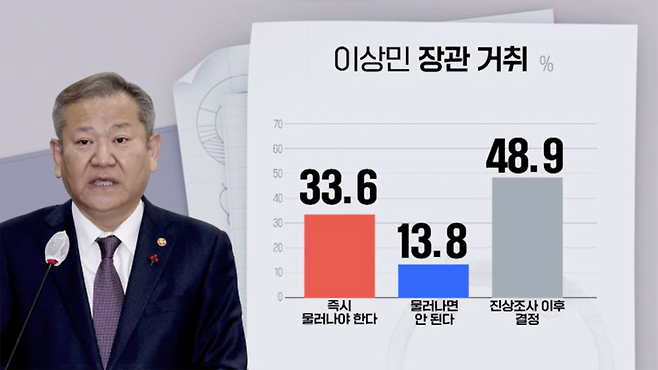 이상민 행정안전부 장관의 거취에 대해서는 진상조사 이후에 거취를 결정해야 한다는 응답이 절반에 육박했습니다.